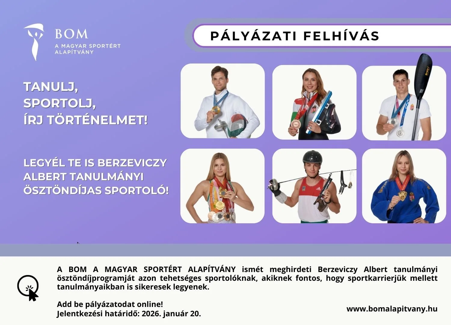 Ha számodra is fontos, hogy a sportkarriered mellett tanulmányaidat is sikerrel építsd, csatlakozz a BOM ösztöndíjasok közösségéhez és élj a program kínálta lehetőségekkel!